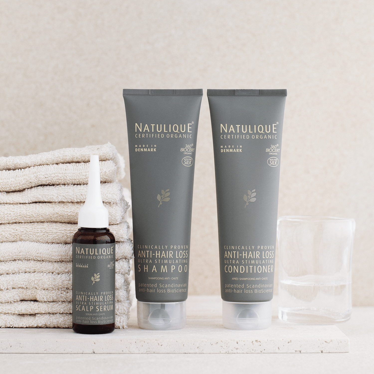 La solución natural contra la caída del cabello. El shampoo anti hair loss ayuda a prevenir la caída del cabello. Estimula los folículos pilosos mientras aumenta el grosor de cada mechón de cabello. Un acondicionador orgánico certificado, con aloe vera, aceite de almendras y extracto de oliva. Ayuda a prevenir la caída del cabello y estimula el crecimiento natural del cabello. El scalp serum es una solución anticaída y crecimiento del cabello ultra estimulante, clínicamente probada, que estimula de forma eficaz e instantánea los folículos pilosos y previene una mayor caída del cabello.